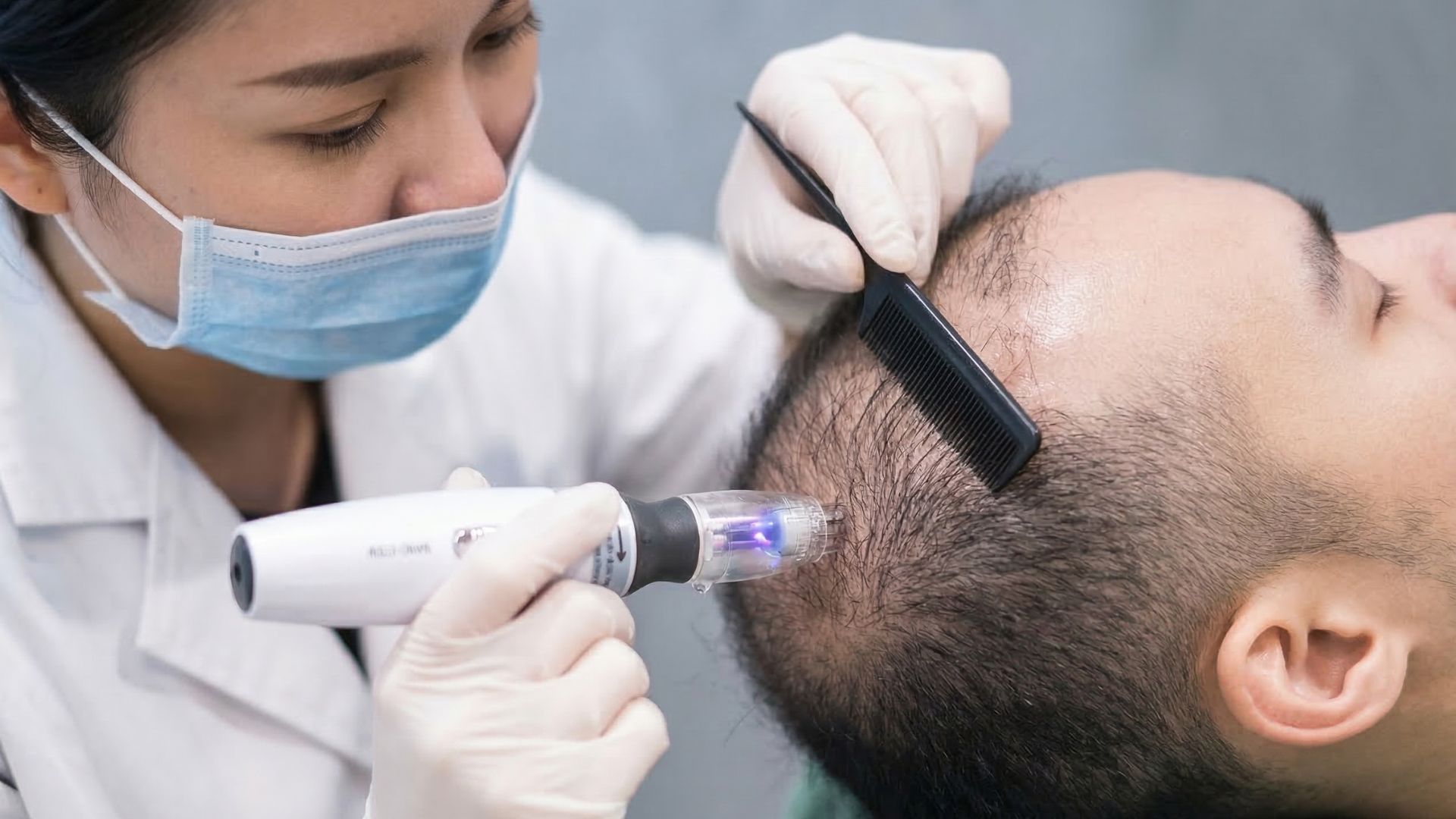 Chúng tôi cấy Biotin - không phải cấy tóc. Cấy tóc chảy máu nhiều, nguy cơ nhiễm trùng cao, và rất rất đau. Công nghệ mới tới từ Korean của chúng tôi: đưa (rải) các hạt Biotin đều trên vùng hói, các hạt Biotin này sẽ kích thích, giúp cho nang tóc phát triển trở lại.